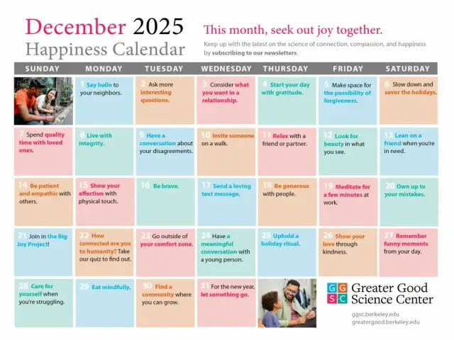 Nuestro Calendario de Felicidad mensual es una guía diaria para el bienestar. Este mes esperamos que les ayude a buscar la alegría juntos.