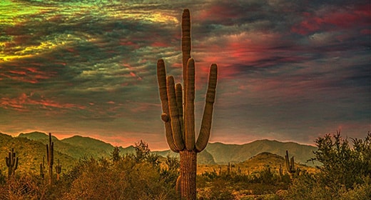 Cactus Saguaro y el hermoso paisaje del desierto al atardecer de Arizona.
