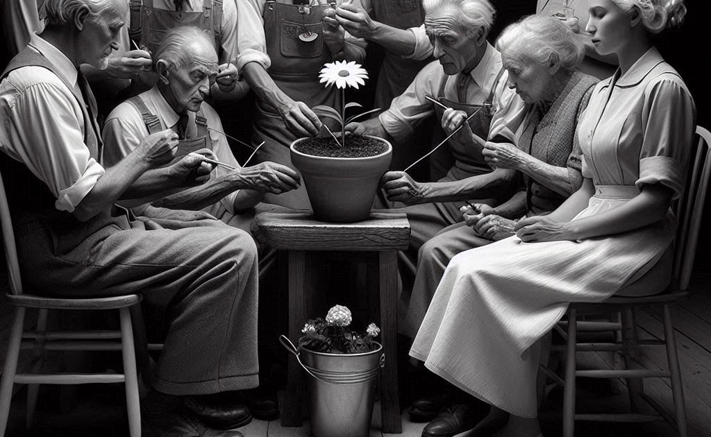 El amigo jardinero de Monseñor coloca sobre una mesa un pequeño recipiente similar a una maceta común y corriente. Por fin, los lleva al clímax de su visita: la creación real de una flor. En este recipiente vierte un poco de «tierra» y pide a Monseñor y a sus amigos que vigilen el recipiente sobre la mesa.