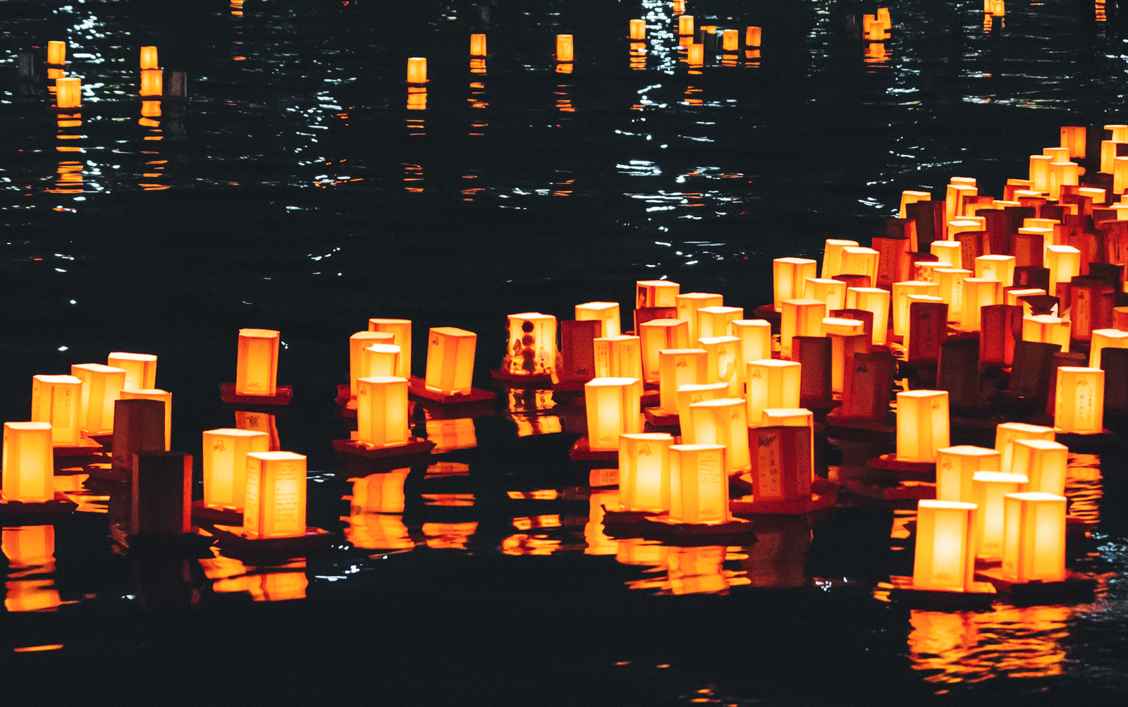 Luego experimentamos algo que en todos los años que he asistido a las ceremonias de Obon, sólo ha sucedido una o dos veces. Los botes se alejaron remando en silencio y las brillantes linternas se colocaron en el agua tranquila. Una luz blanca en el cielo se hizo cada vez más fuerte. Cuando las linternas regresaron al mundo de los espíritus, a la otra orilla, la gloriosa luna llena se elevó lentamente sobre la montaña, justo frente a nosotros. ¡Namu Dai Bosa!