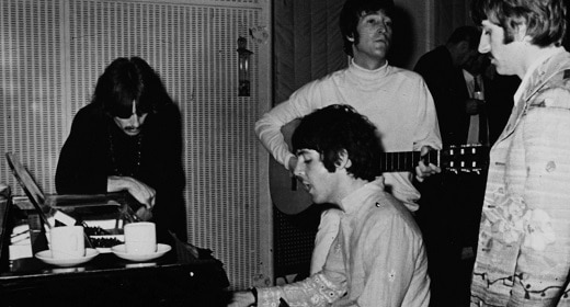That recording session became a ’60s happening, with Beatles’ friends like members of the Rolling Stones and the Monkees and their sexy wives and girlfriends (like Pattie Boyd and Marianne Faithfull) turning out in the trippy regalia of the time. The orchestra wore proper dress-performance clothes. The Beatles handed out novelty-shop gag items: clown noses (for the very upstanding violins), plastic spectacles (for the more ebullient woodwinds and brass), wigs, balloons, whistles.